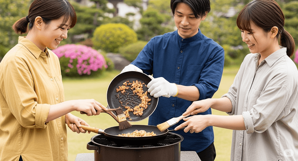 刃音録ーイメージこの記事を通じて、フライパンの油汚れや焦げ付き、とくに外側の頑固な汚れを効果的に落とすためのさまざまな方法をご紹介しました。